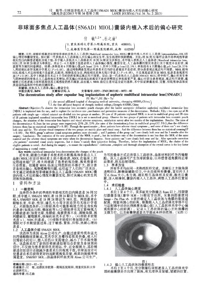 非球面多焦点人工晶体(SN6AD1+MIOL)囊袋内植入术后的偏心研究
