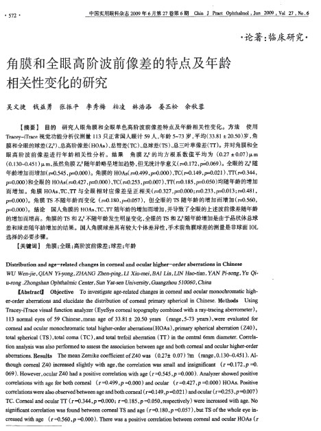 - 角膜和全眼高阶波前像差的特点及年龄相关性变化的研究